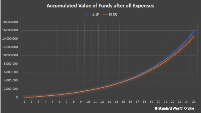 Remember we assumed market returns at 15% p.a. However, both ULIP and ELSS will generate a slightly lower return due to the scheme expenses. So here’ what the chart gives out:
