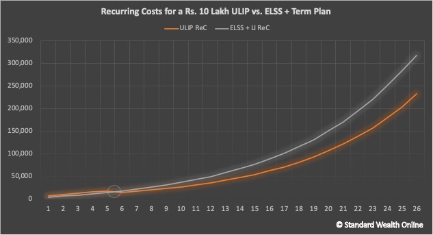For the first five years, ULIPs charges (recurring + fixed) remain above ELSS schemes. From sixth year onwards the ULIP’s expense ratio dramatically drops below ELSS and continues, resulting in a huge expense ratio.