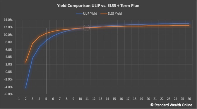 The yield curve for ULIP surges ahead of the ELSS + Term Plan in the 13th year of investment. For the first 12 years, the ELSS + Term combination offers you higher returns.